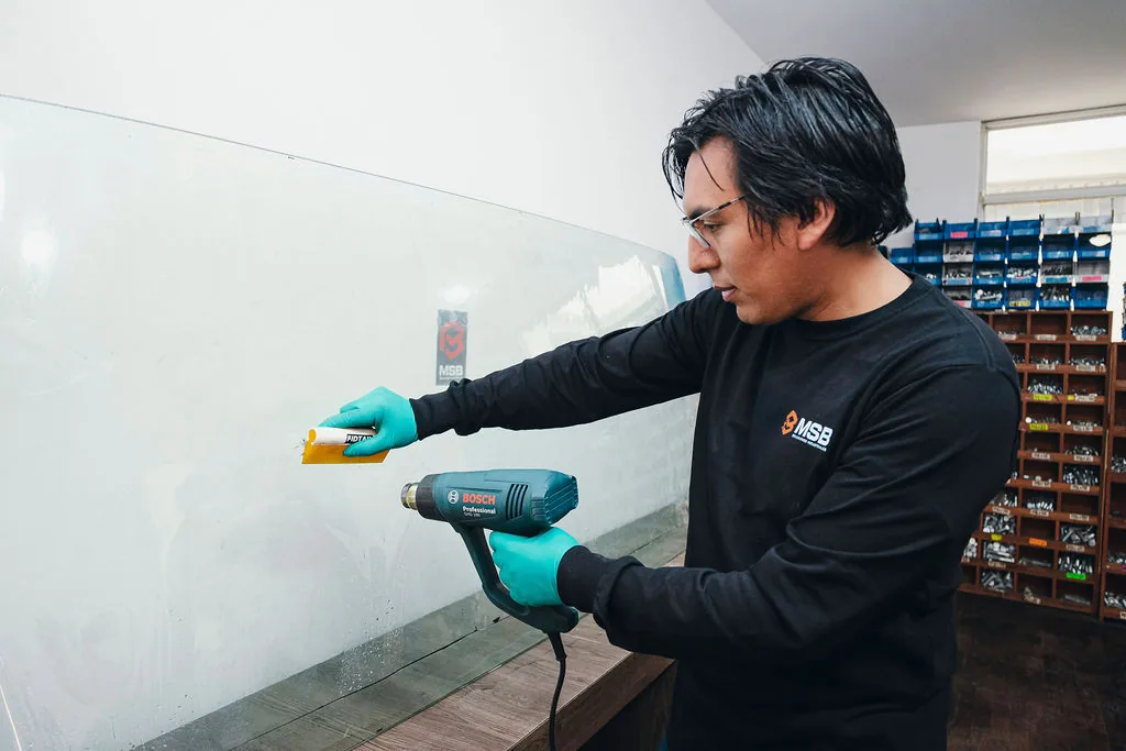 Aplicación de micas de seguridad en parabrisas y ventanas de cabina. Ante un impacto, el vidrio no se fragmenta — protege al operador y mantiene la visibilidad sin parar el equipo.